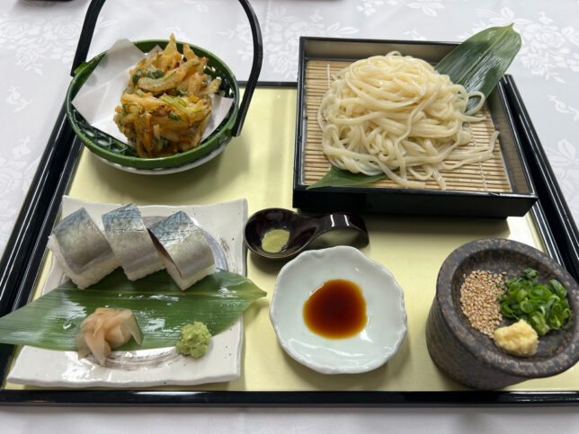 ラウンド後、お風呂に入って、レストランで新メニューの「かき揚げざるうどんと鯖寿司」を食べました。朝7時21分のスタートで、ラウンドして、お風呂に入って、食事して12時半には家に着きました。