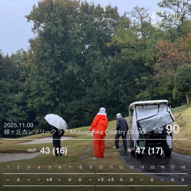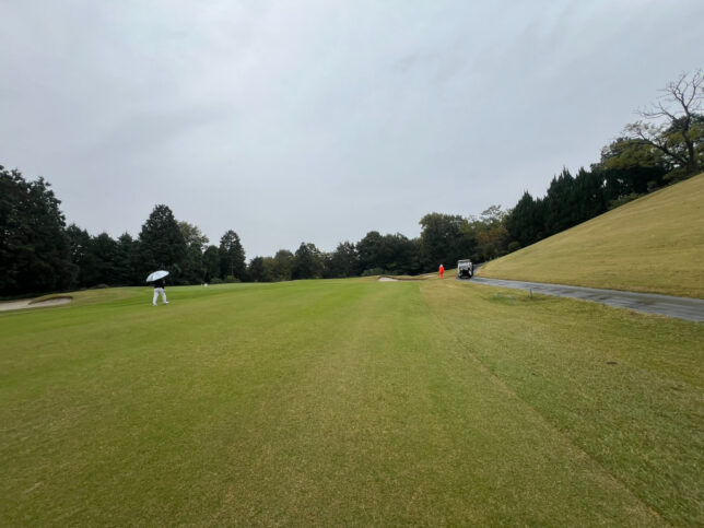 雨が降る中のインスタート。何人かの人がスタート前から、ハーフで辞めようか・・と言ってました。10番11番と2連続トリスタートで、自分もハーフで辞めようと思ったりして・・一度そんな事思うと、プレーが雑になります。前半47点。
