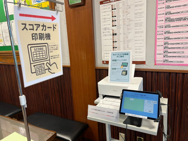 セルフスコア印刷機・・これは初めてみました。ロッカー番号を入力すると、同じ組全員のスコアカードが出てきます。