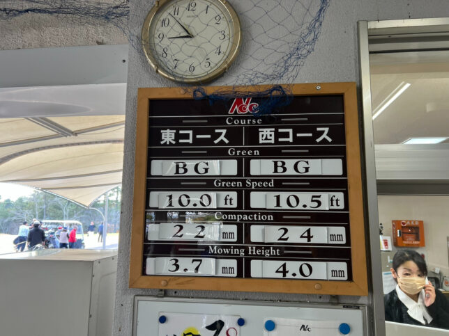 この日は西コースのアウトスタート。グリーンは10.5フィートと速めです。キャディさんは男性の研修生くん。聞くと日本ラインには研修生が何人もいるそうです。打ち納めなのでいいスコアで回りたいのですが・・・